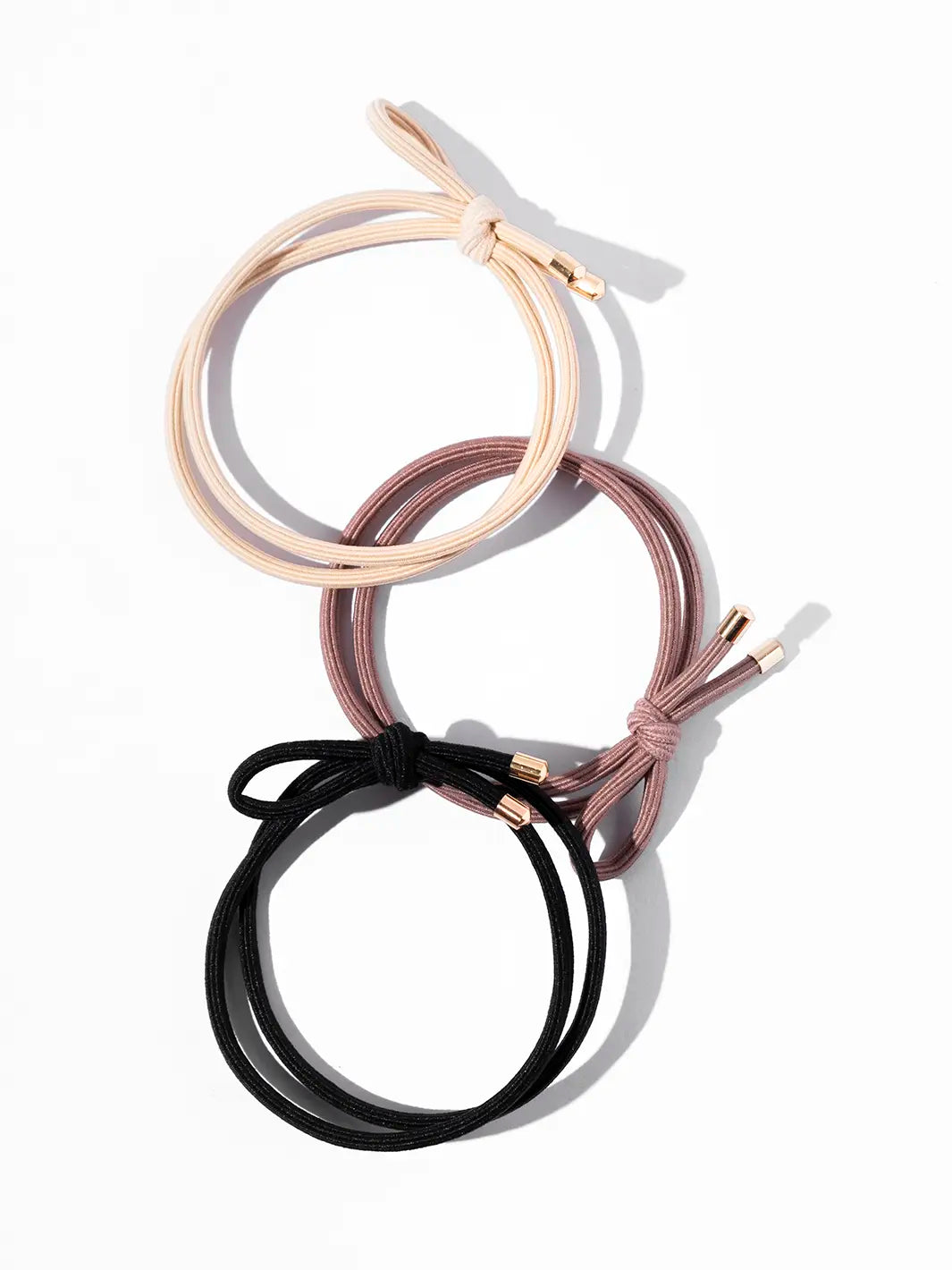 Finished with sleek gold-tone metal caps on the ends, these elastic bows are both durable and stylish. The set includes three timeless colors—black, mauve, and cream—perfect for any outfit or occasion. Easy to slip on and gentle to remove, they’re ideal for adding a hint of elegance to any hairstyle.